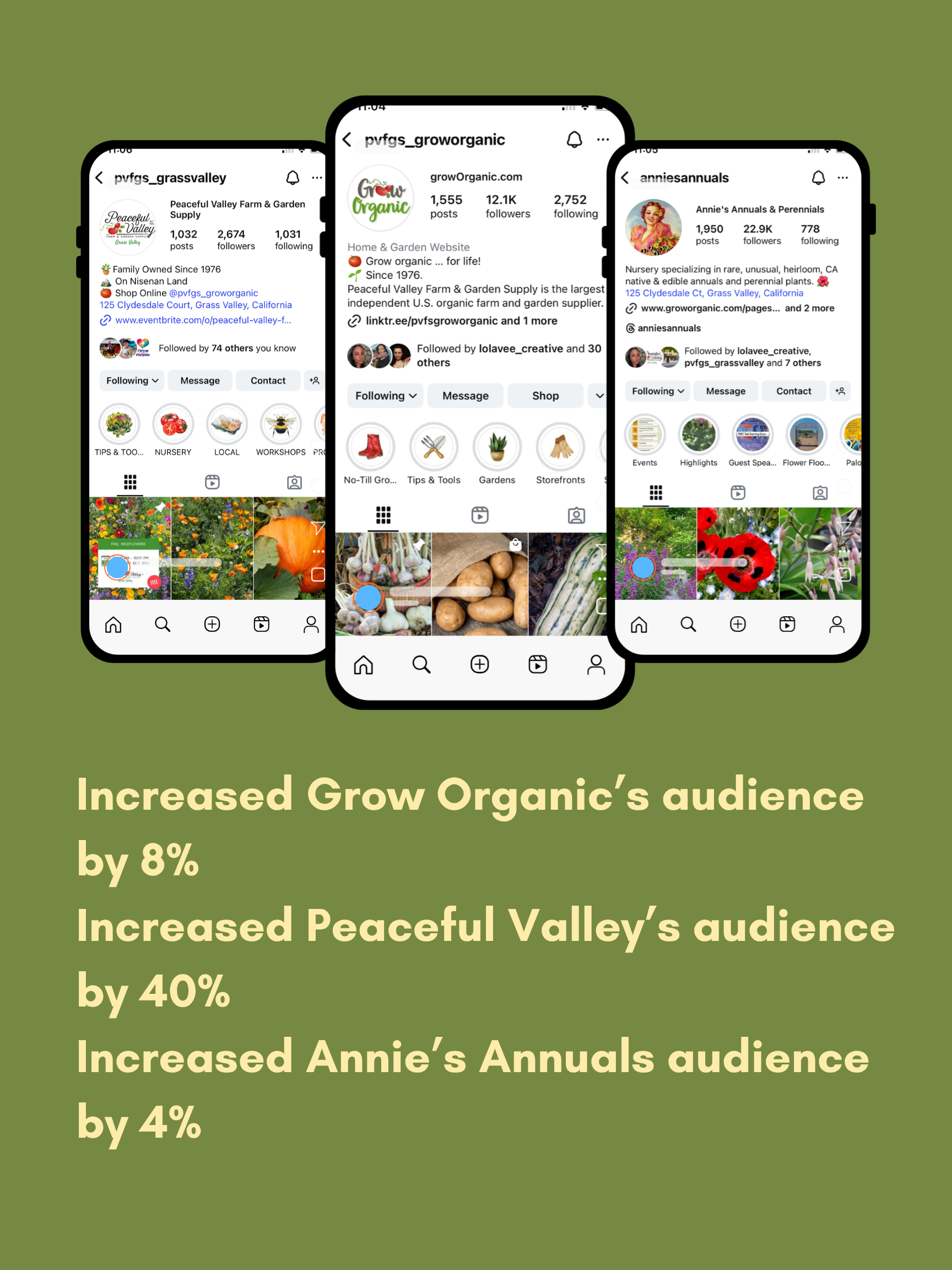 As marketing coordinator I executed a targeted social media strategy to increase Grow Organics' follower count by 8% over six months and boost engagement by 5% across Facebook, Instagram, and Pinterest. We also increased Peaceful Valley’s audience by 40%, and Annie’s Annuals by 4%. Key initiatives included: