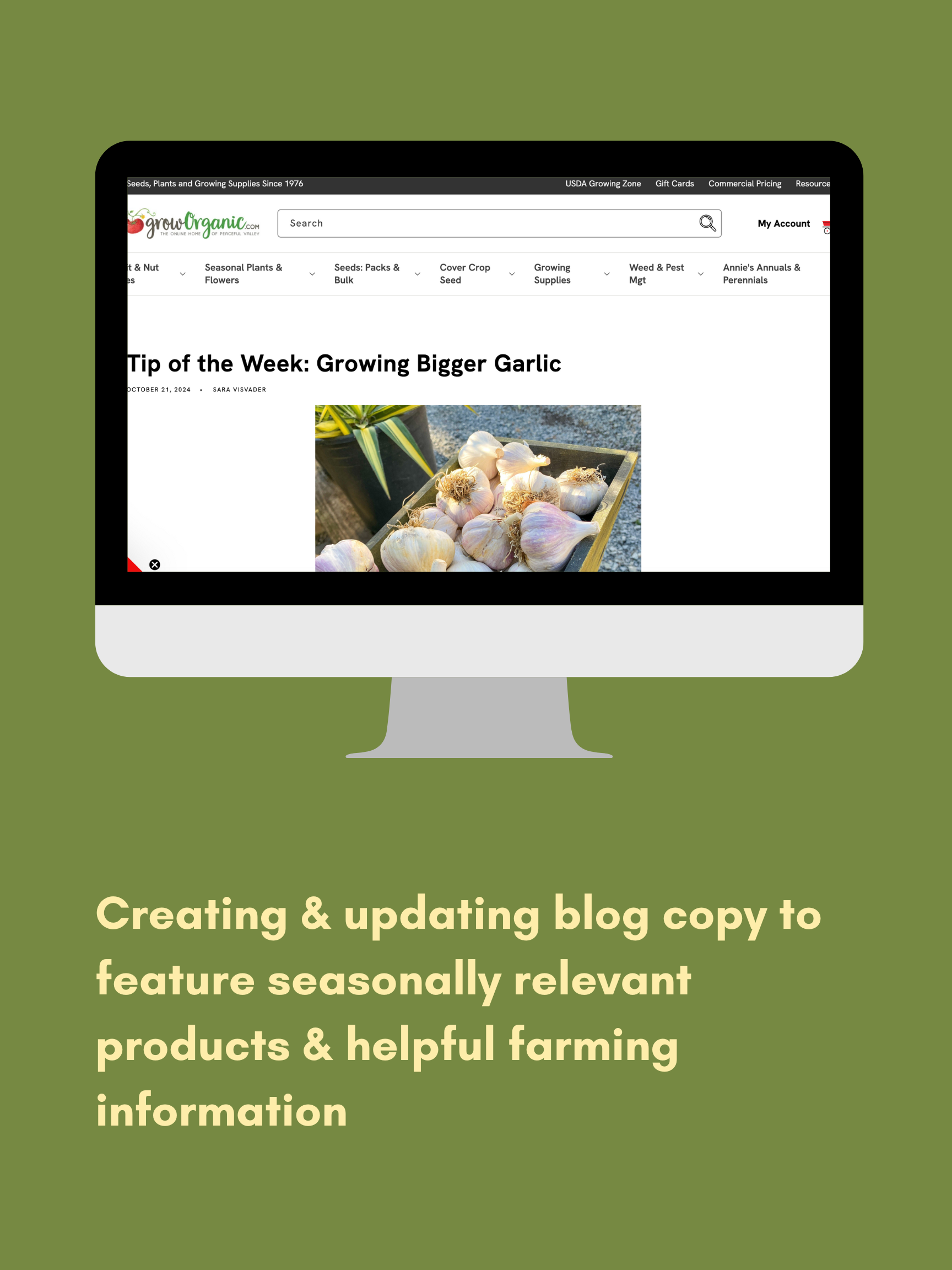 As marketing coordinator I managed weekly blog updates for GrowOrganic.com, maintaining and organizing content on a complex Shopify platform. In addition to writing and formatting posts, I created and uploaded custom graphics to enhance the website’s visual appeal and user experience.
